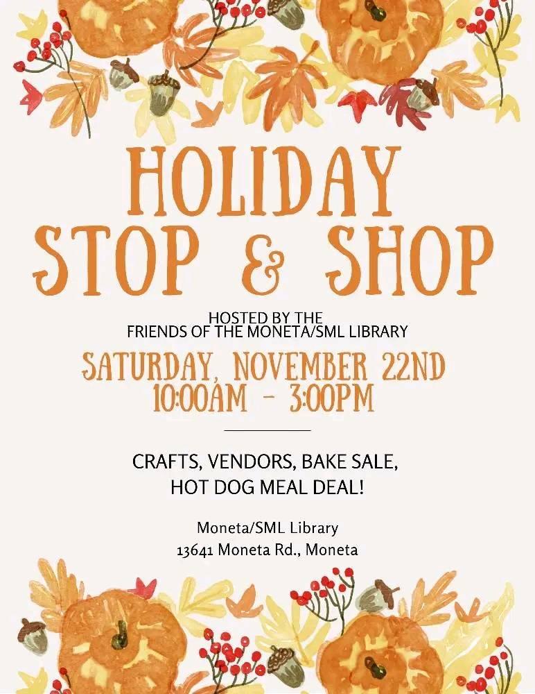 You're invited to the 1st Annual Holiday Stop & Shop at the Moneta Library, where you'll enjoy shopping for unique handcrafted items.