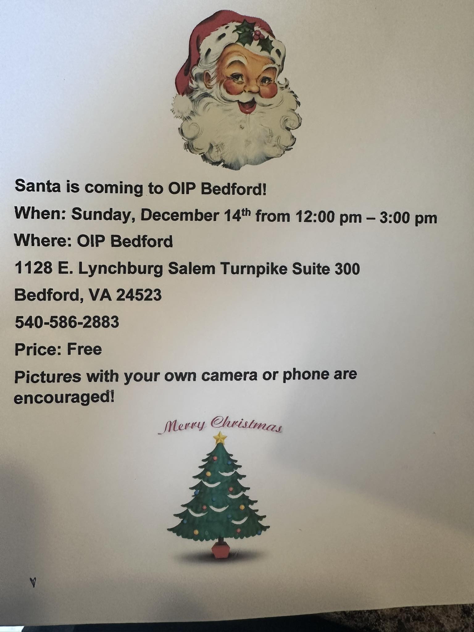 Santa is coming to OIP Bedford on Sunday, December 14th from 12:00 pm to 3:00 pm! Stop by OIP Bedford for a free holiday visit and bring your camera or phone to capture your own photos with Santa. For more information, call 540-586-2883. Merry Christmas!