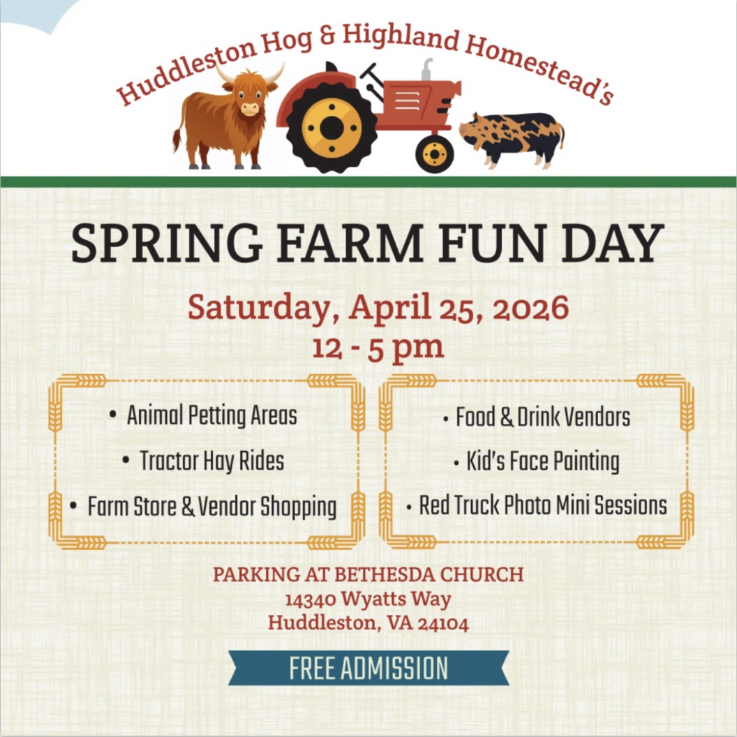 Saturday, April 25, 2026 from 12-5pm There’ll be: -Animal petting areas -Tractor Hay Rides -Kid’s Face Painting -Huddleston Homestead’s Farm Store -Local Farm & Artisan Vendors -BBQ with Huddleston Homestead’s Meats - Special Thanks to Porter House BBQ! -Food & Drink Vendors (The Messi Lemon’s Lemonade and more!) -Red Truck Mini’s with Kylie Akers (Details...