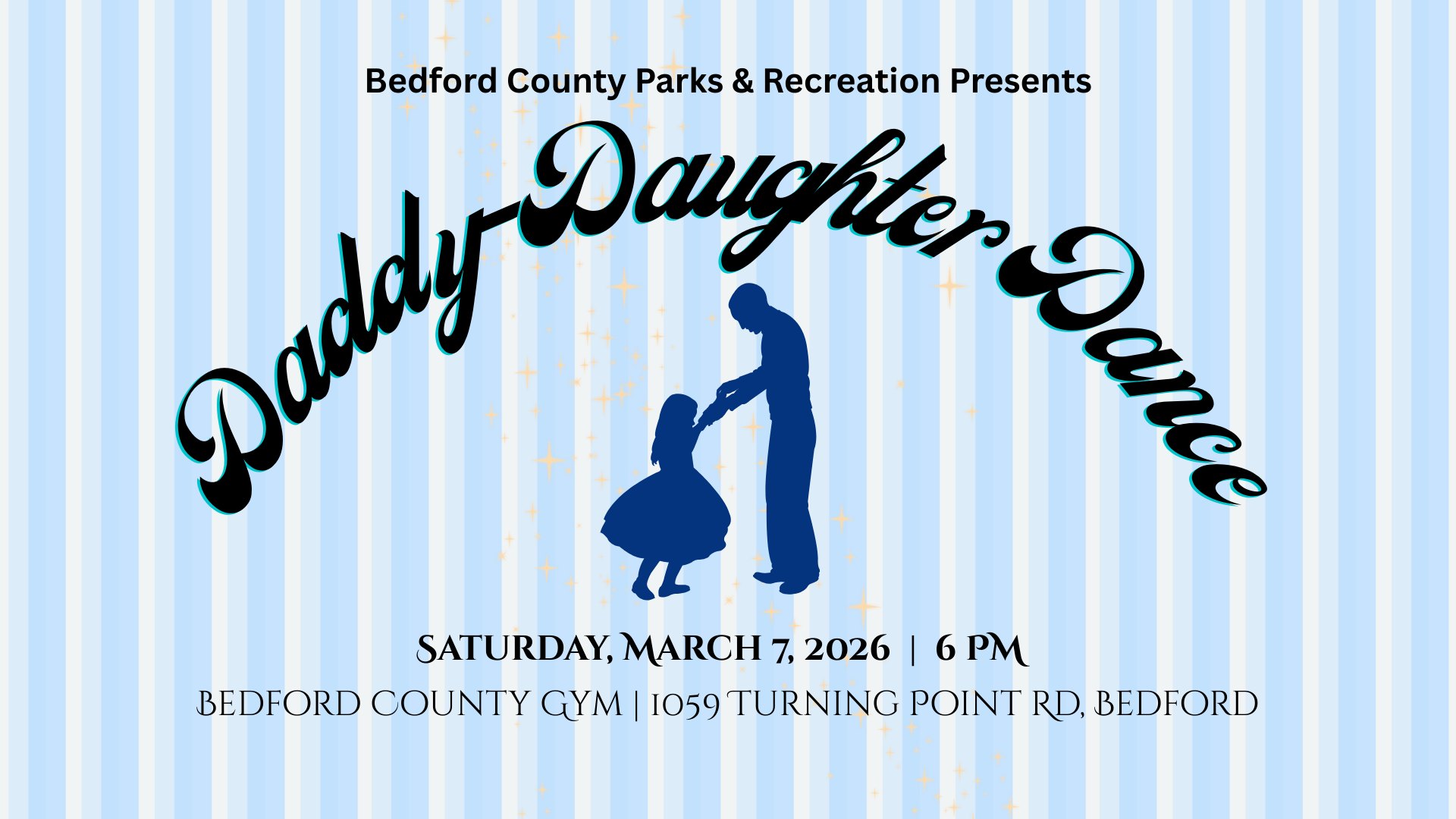 Daddy/Daughter Dance presented by Bedford County Parks & Recreation!  -Fathers/Father Figures, bring your daughters out for a night of dancing and fun! -Saturday, March 7th, from 6:00 to 8:00 p.m. -Bedford County Gym (1059 Turning Point Rd., Bedford). -$20/couple & $5/additional daughter  Sign up here: https://vabedfordweb.myvscloud.com/webtrac/web/