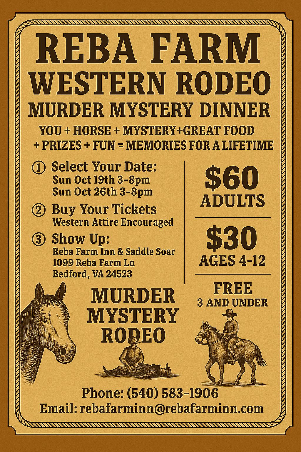 Come To Reba Farm for their Giddy Up & Die Murder Mystery Dinner! This event is by Scott Thompson. There are two dates: Sunday October 19th & October 26th from 3-8pm. Cost: Adults $60, Children 4-11 years old $30, Children 2 years & under are free. *Western wear is encouraged. Tickets on Sale:...