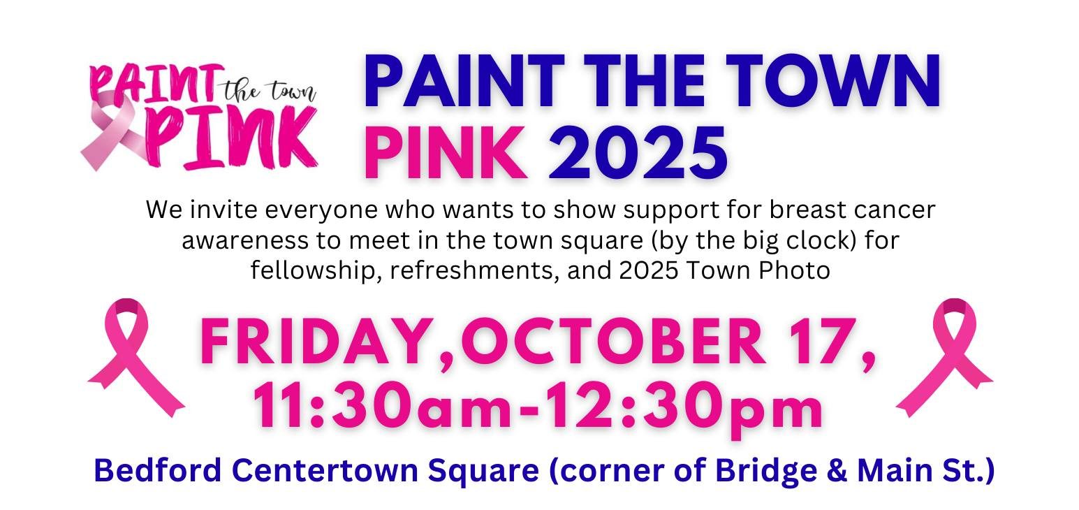 All are invited to show their support for breast cancer awareness in Bedford’s Centertown Park! This is located at the corner of Bridge and Main Streets. Come for fellowship, refreshments, and this year’s group photo! -Wear PINK to be in this year’s Town Photo (Around 12:15pm) - PTTP T-shirts will be available for purchase at...