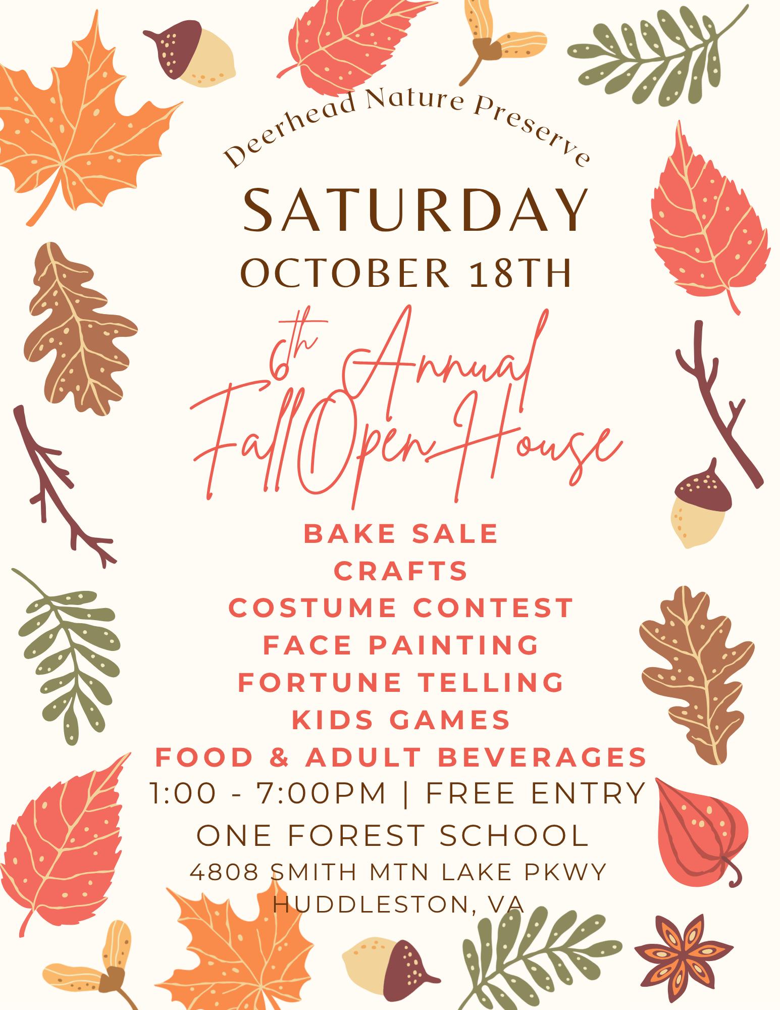 Join One Forest School for their 6th Annual Fall Open House on Saturday October 18th! Open to the Public! Costume contests, pumpkin painting, face painting, great food, adult beverages, bonfire, crafts, kids games, fortune telling, and more!