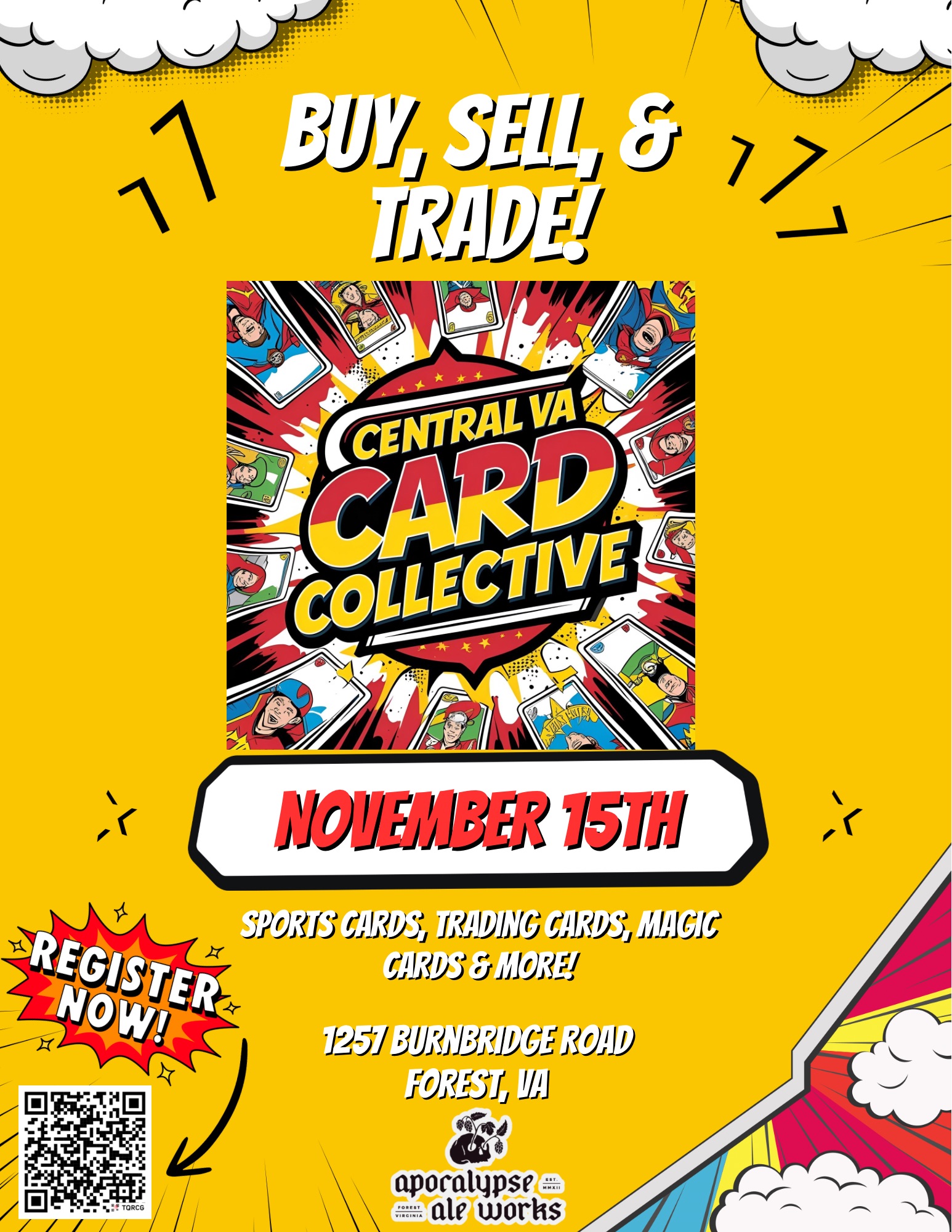 Apocalypse Ale Works 1257 Burnbridge Road, Forest, VA, United StatesCard collectors and craft beer fans, this one’s for you! Spend an afternoon buying, selling, and trading sports cards and TCGs (Pokémon, Magic, Yu-Gi-Oh! and more) in the taproom at Apocalypse Ale Works. What to expect • vendors featuring vintage and modern sports, Pokémon, and other TCG singles, slabs, and sealed product • Friendly trading...