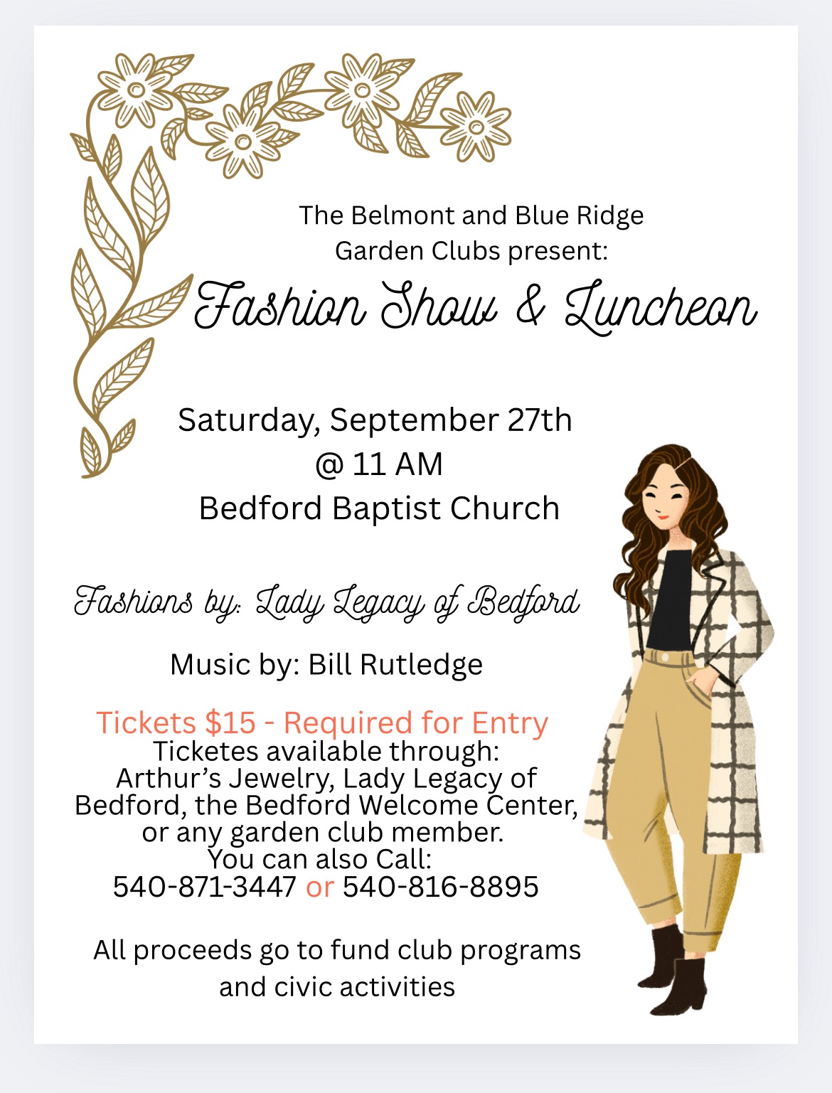 Come enjoy a fashion show and luncheon sponsored by two garden clubs with fashions provided by Lady Legacy of Bedford and live music by Bill Rutledge at Bedford Baptist Church, 1516 Oakwood Street! There will be lots of door prizes to win and flower arrangements to bid on. You won’t want to miss this fun...
