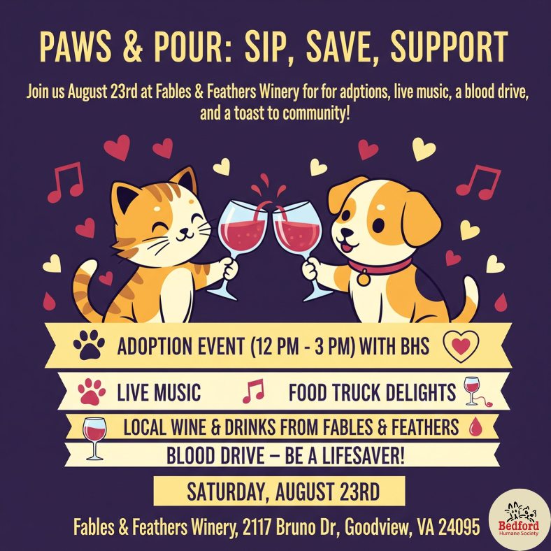 It's a good day to do good! Come on out to the winery and donate blood, donate dog food, and maybe meet the new (furry) love of your life! The Bedford Humane Society will be at Fables & Feathers Winery with adoptable pets from 12-3. Bring food, treats, litter, or any other donations for extra...